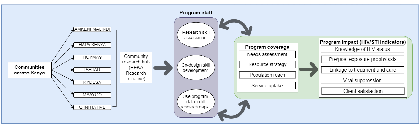 HEKA is rooted in the Program Science framework, an iterative approach linking research and program implementation. Through collaborative workshops and ongoing virtual engagements, the community-based organizations partnered closely with academic collaborators to build skills in quantitative research methods and R programming. This partnership shifts the role of community members from data providers to active data users and researchers, empowering them to independently analyze and apply their own program data to enhance HIV/STI services.